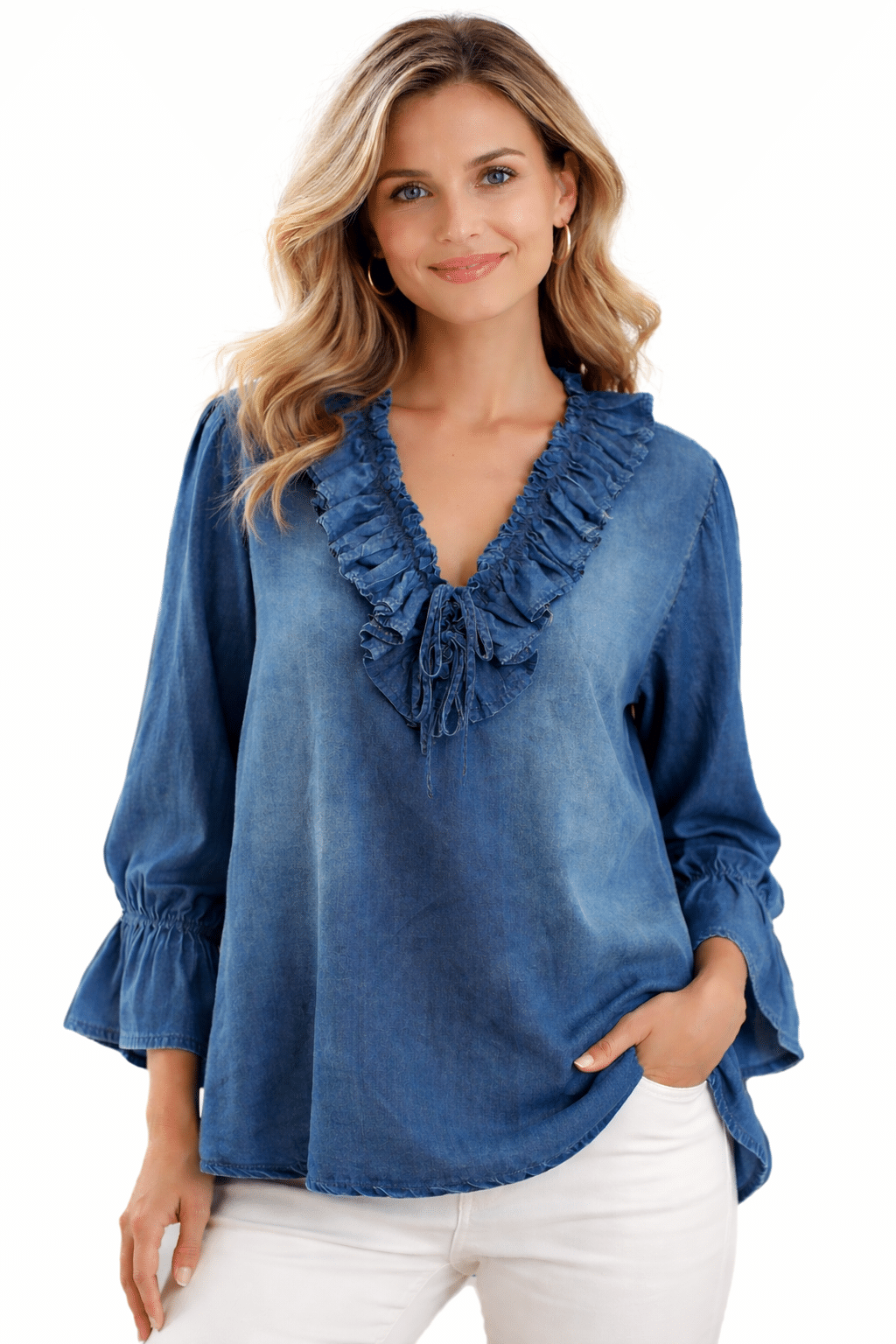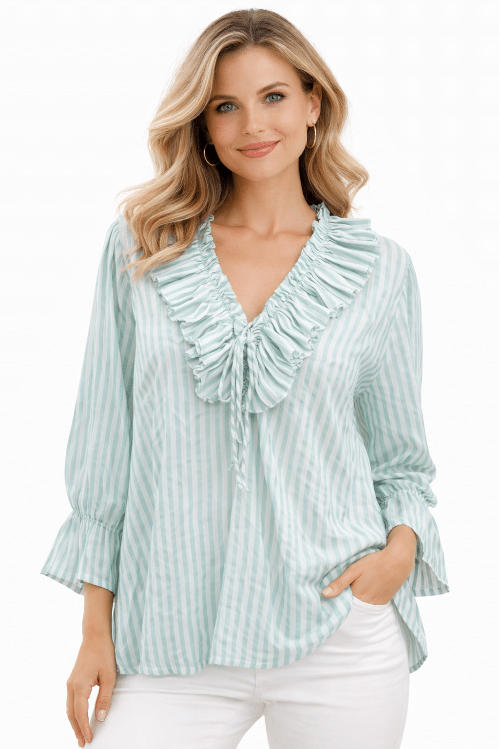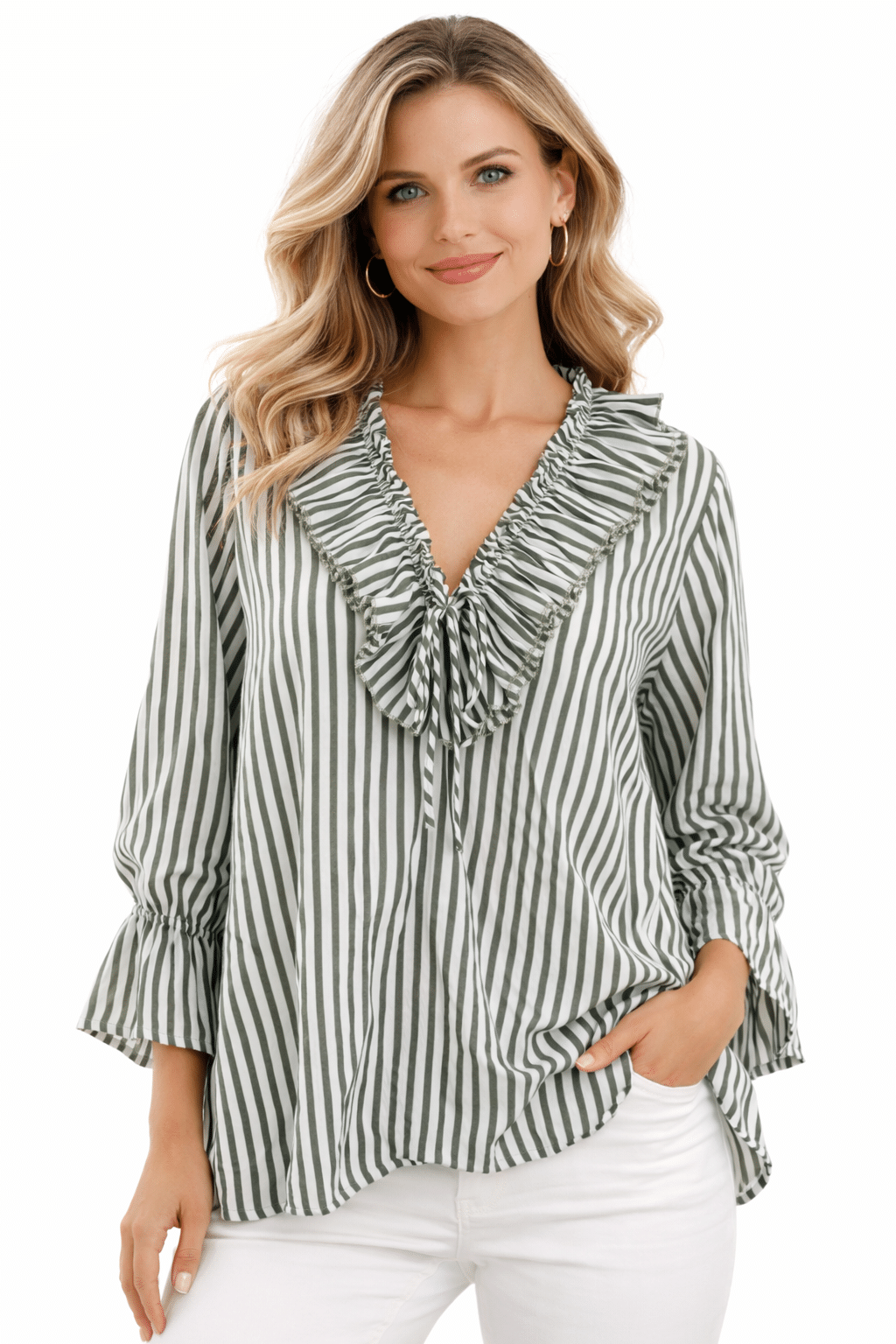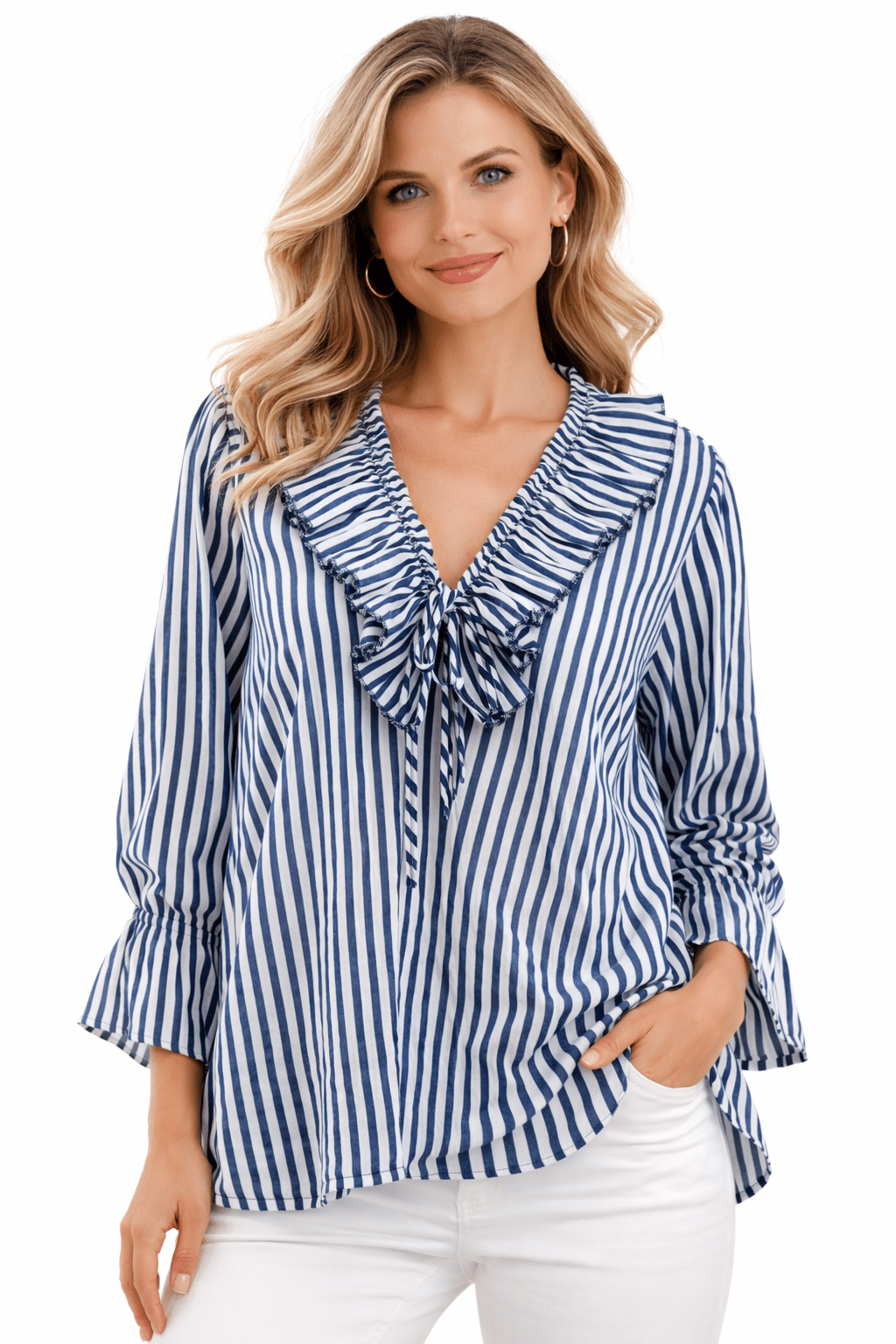 Lightweight pinstripe lagenlook blouse featuring a flattering neckline and stylish flared cuff long sleeves for an elegant, relaxed silhouette. Designed with a longer length hem, this versatile top can be worn tucked in or left out, making it perfect for effortless everyday styling. Crafted from 100% breathable cotton and proudly Made in Italy, this piece blends comfort with timeless Italian clothing style, ideal for layering or wearing on its own for a chic lagenlook outfit.