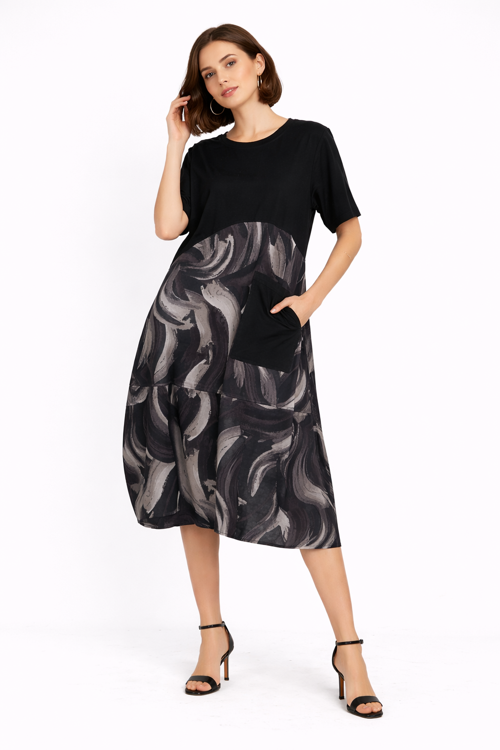 A chic lagenlook design from Obsession, this balloon silhouette dress combines a stretch rayon-blend upper panel and sleeves with a silky printed polyester lower section for fluid movement.