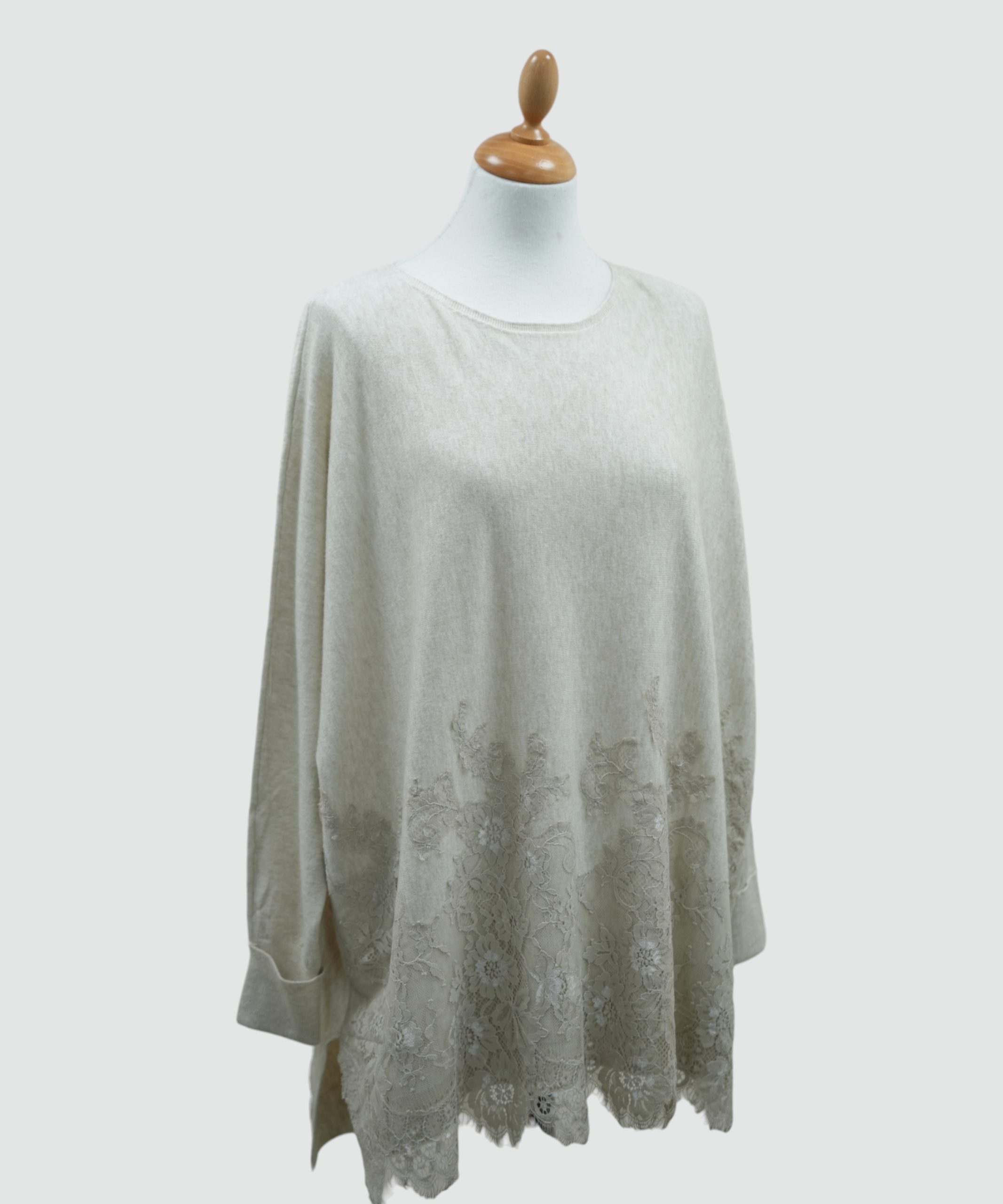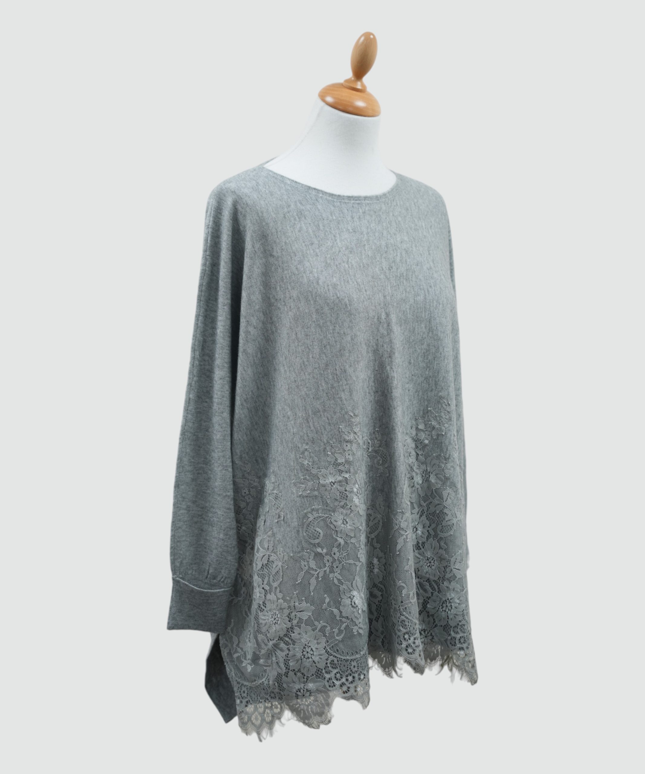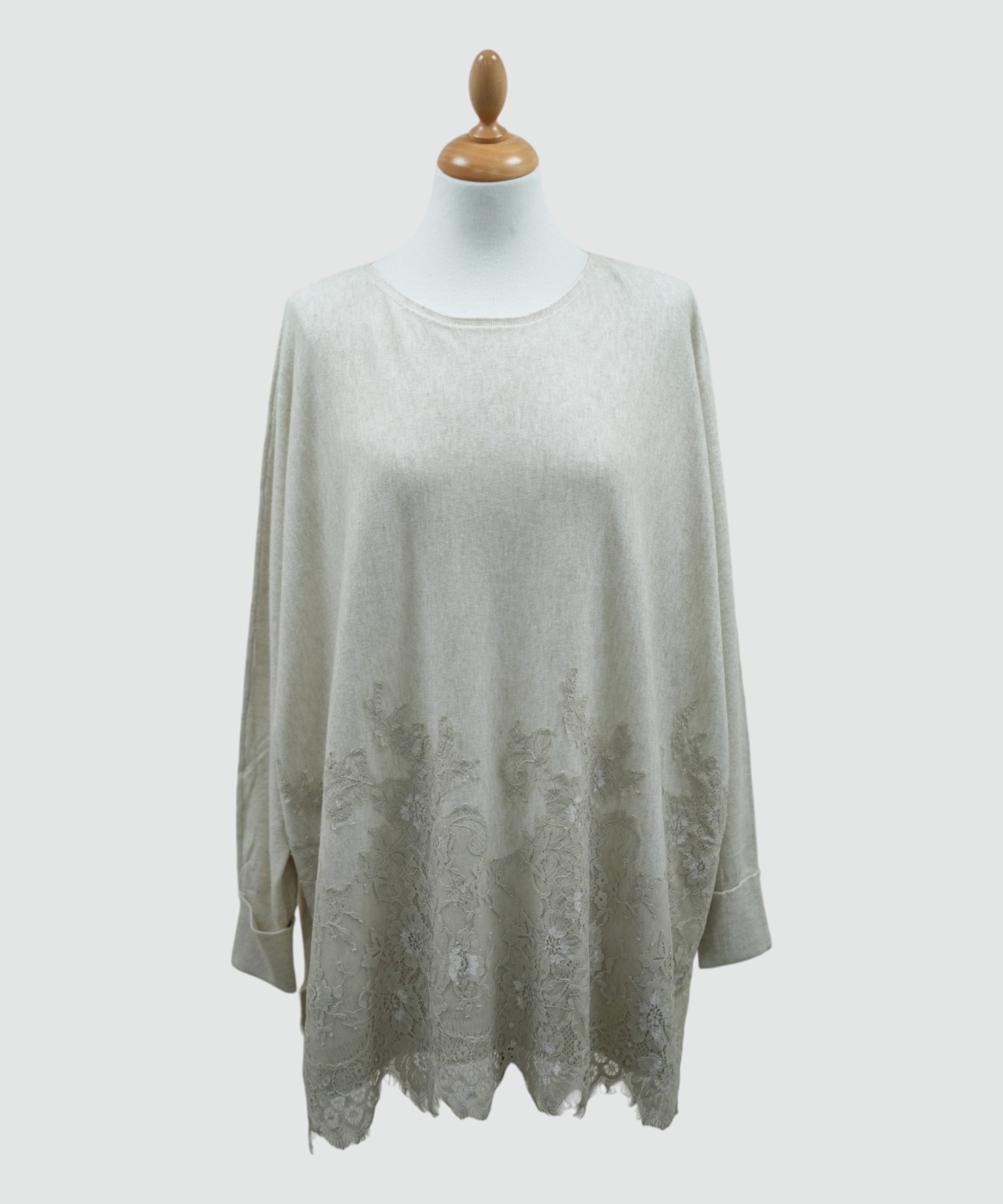 A beautifully soft fine‑knit long jumper featuring a classic round neckline, relaxed batwing sleeves, and a delicate lace overlay to the front for an elegant, feminine touch. Lightweight with a gentle drape, this piece blends comfort with subtle detailing — perfect for layering or wearing as a standout knit on its own.